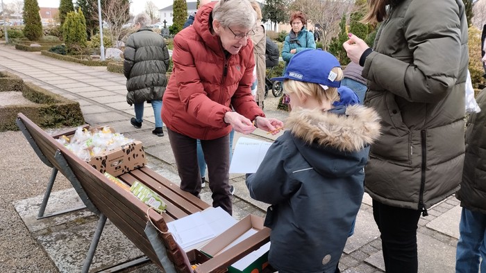 Vi indleder påskeugen med en familiegudstjeneste i Hellevad Kirke, hvor børnene på festlig vis bærer palmegrene ind i kirken. Gudstjenesten er tilrettelagt med flere gængse salmer, så alle kan synge med. Efterfølgende arrangeres der æggejagt på kirkegården.